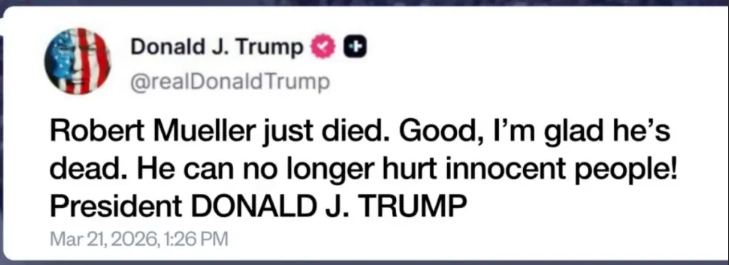 And then came the post about Robert Muellerā¦celebrating a manās death. Not criticizing. Not disagreeing. Celebrating. Thatās not just breaking normsāthatās bulldozing basic human decency and replacing it with something darker.