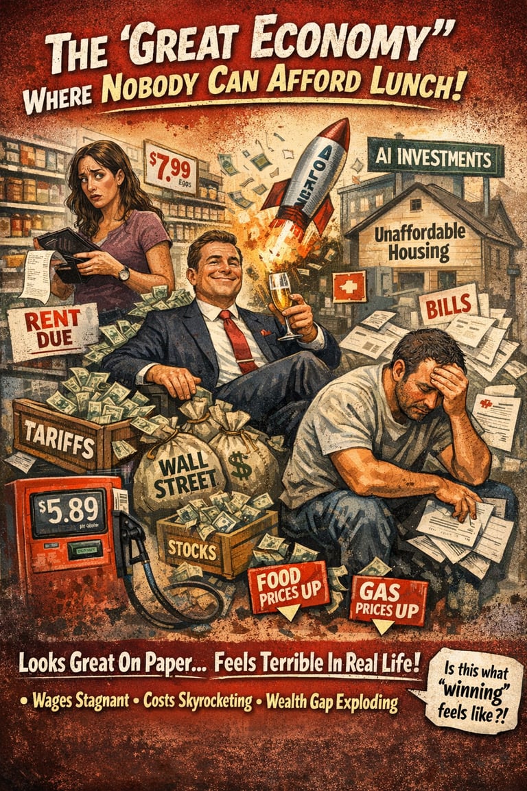 Trump keeps telling you the economy is “booming.” Funny thing… nobody standing in a grocery aisle or staring at a rent bill seems to have gotten the memo. Let's not even talk about gas......