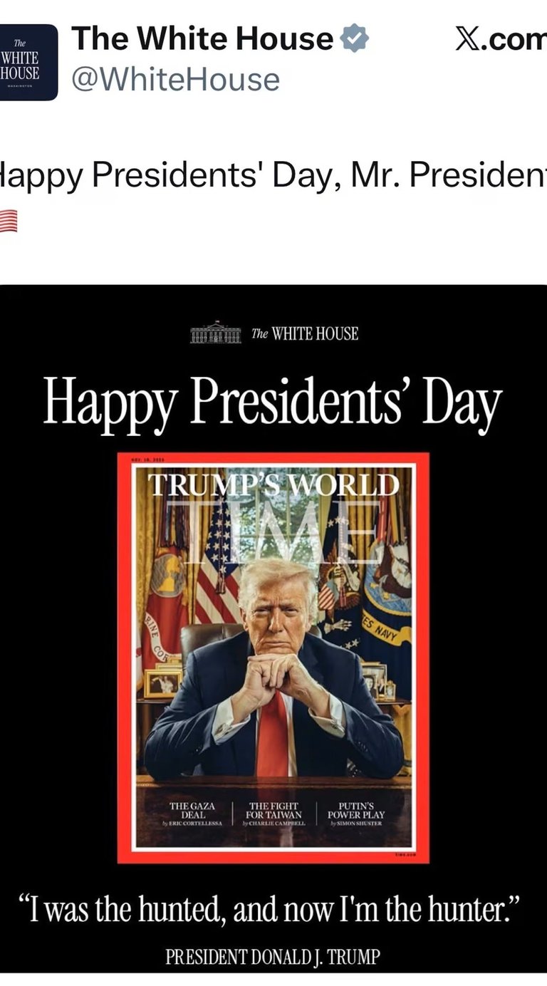 On a federal holiday meant to honor the presidency and the legacy of George Washington, the administration posted an image of Donald Trump styled like a Time magazine cover with the words: “I was the hunted, and now I’m the hunter.” The caption read, “Happy Presidents’ Day, Mr. President.”